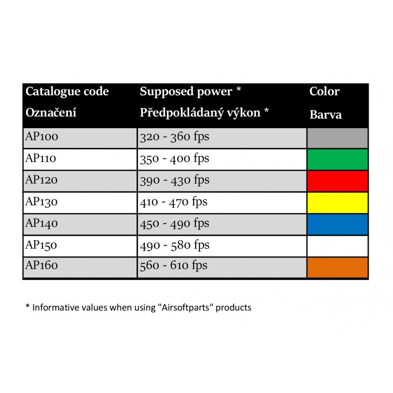 AEG pružiny jsou vyrobeny z vysoce kvalitního ventilového drátu, který je speciálně pro naši aplikaci vyráběn v Německu. Během dlouhodobého vývoje se nám podařilo vyvinout pružiny, které dosahují konstantní síly po celou dobu jejich životnosti. Samozřejmostí je tepelné zpracování a proměnné stoupání.